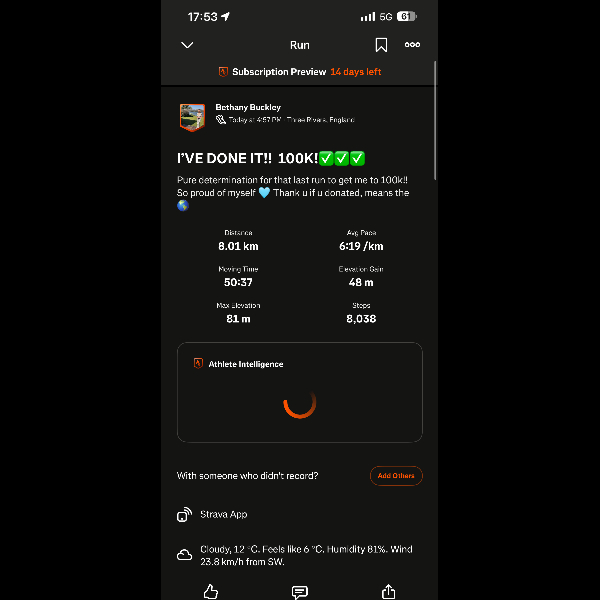 Knee brace & paracetamol got me through today! 5k a day till the end…let’s go!43/100✅