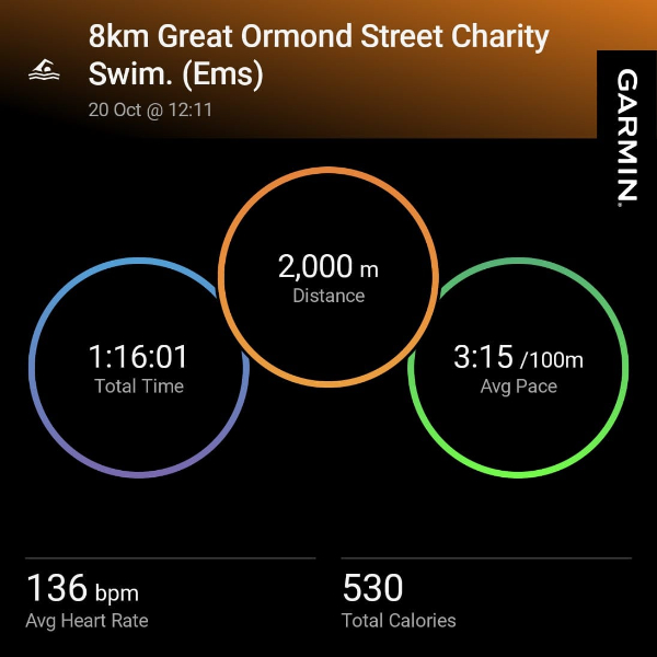 This October I will taking part in an 8k sponsored swim. I would like to raise money with your help, help Great Ormond Street Hospital go above and beyond for seriously ill children, enabling kinder and better treatments, bringing hope for children with the rarest and most complex illnesses, and making hospital a little bit easier and a lot more fun for the thousands of children who are treated here every year. Every day around 750 seriously ill children and young people are seen at Great Ormond Street Hospital. This hospital depends on charitable support. Your donation can provide life saving medical equipment, research into children's health, support for children and families, rebuilding and refurbishment. Even just a sofa bed for parents so they can stay with their children throughout treatment and keeping families together during scary times.I’m swimming 8km in October for GOSH Charity!