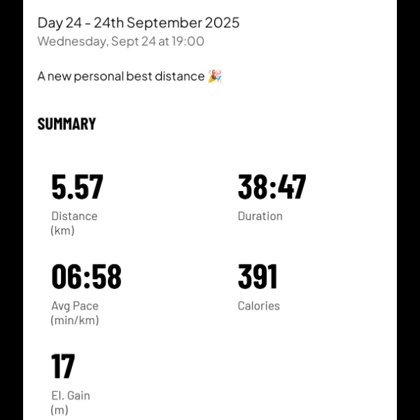 A little easier today, but still too tired to push past the 3.5km mark.Day 7 - 7th September 2025
