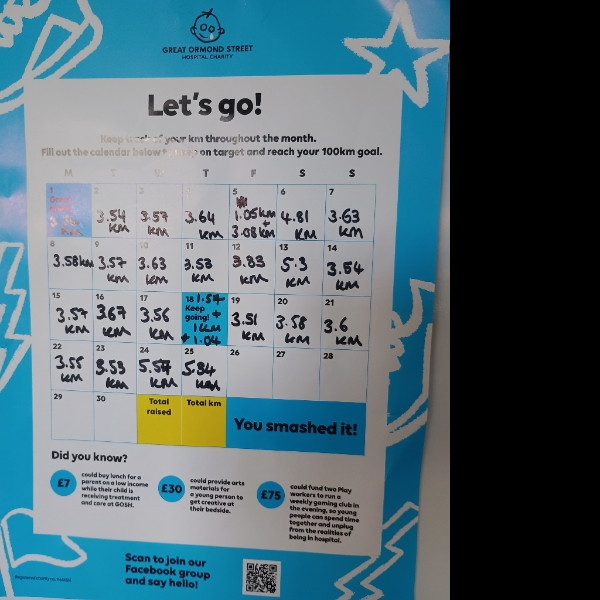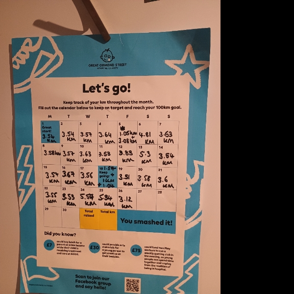 Today also marks my half way point of my 100km challenge to raise money for Great Ormond Street Charity Hospital with 50.3km recorded so far. I can't say it's getting any easier. I'm not a runner. I don't particularly enjoy it and it certainly is a challenge for me. However, it's nothing compared to the challenges the children of GOSH face on a daily basis and I'm very proud to be doing my part to help both our daughter and all those other children make their journeys a little bit brighter.