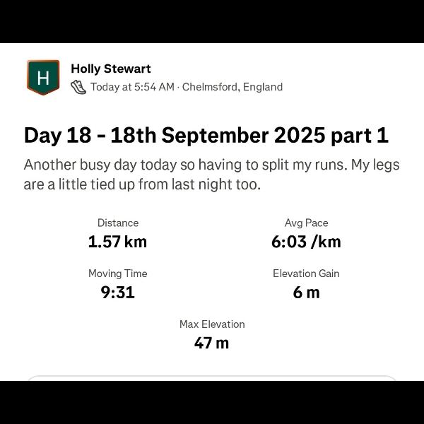 A very windy one this evening. I also stupidly banged my ribs on Saturday and they've been giving me trouble. Today has been especially painful to bend over, pick things up, pull or even breathe deeply. A little challenging for my run today, but I'm not one to be defeated!Day 14 - 14th September 2025