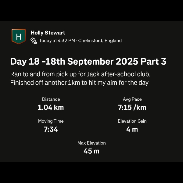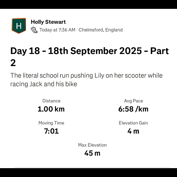 After running another 2.5km, I picked or boy up from his after-school club and we raced home (him on his bike). Unlike this morning, he was on 100% and I had to really sprint the last few hundred yards. He still won!Day 5 - 5th September -2025 part 1