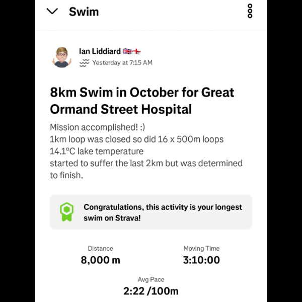 Sunday 5th October.I’m swimming 8km in October for GOSH Charity!