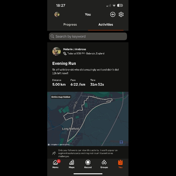 Brother supported me today and we did another 5k round melford. Only 12k to go now and the end is in sight!19.th Sept 5k off