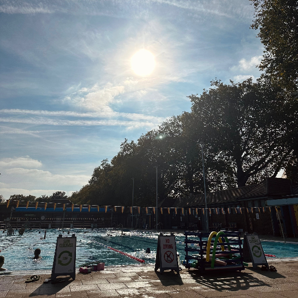 Swimming at London Fields Lido, 50 metres long, surrounded by cool, fresh air on a bright day
